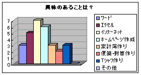やはり、インターネットへの興味が一番高いようです。 また、パソコンで出来るいろいろなことに興味があるようでした。 |